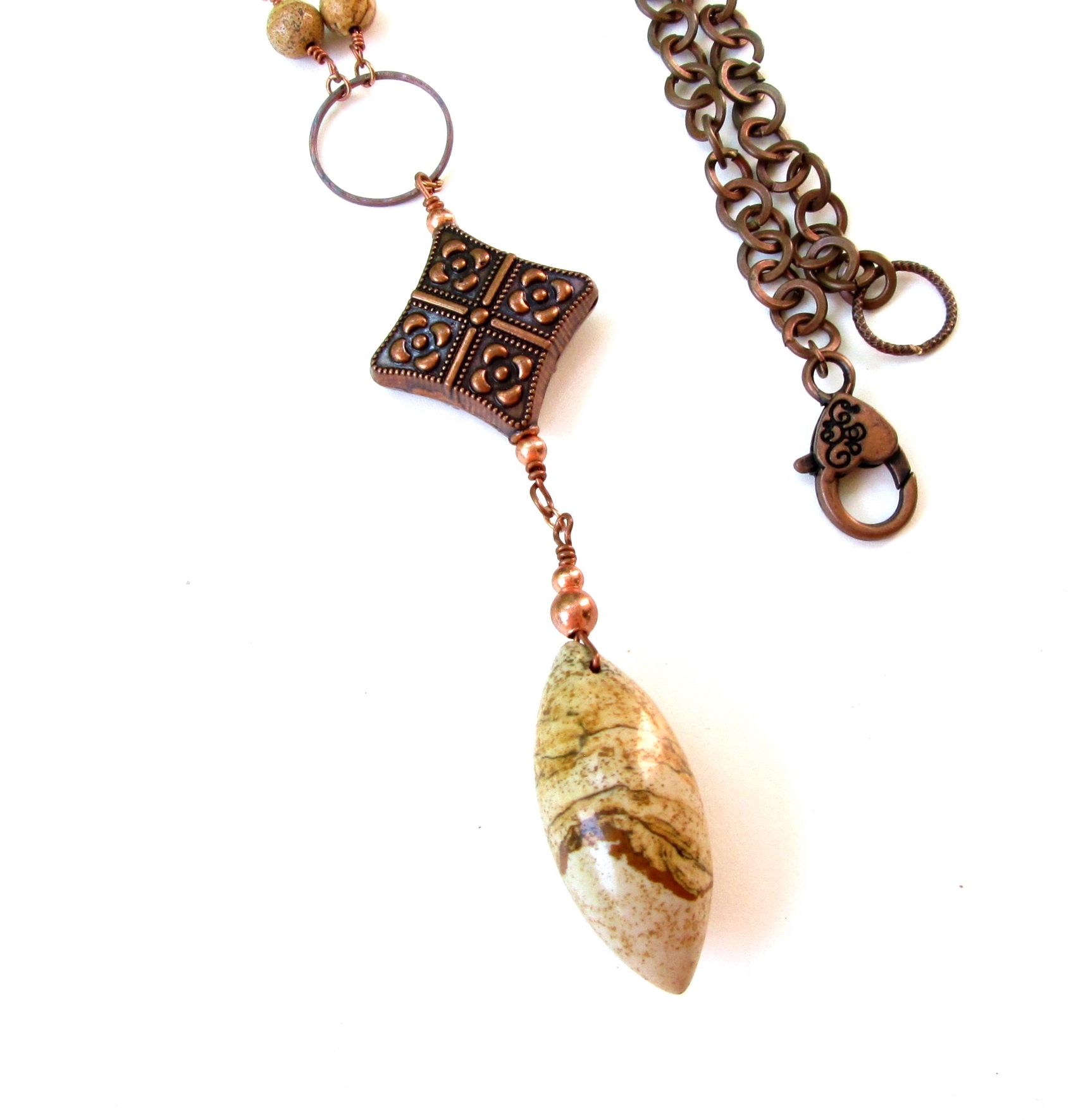 This picture jasper stone pendant is stunning and it goes perfectly with the antiqued copper chain and textured kite shaped bead.